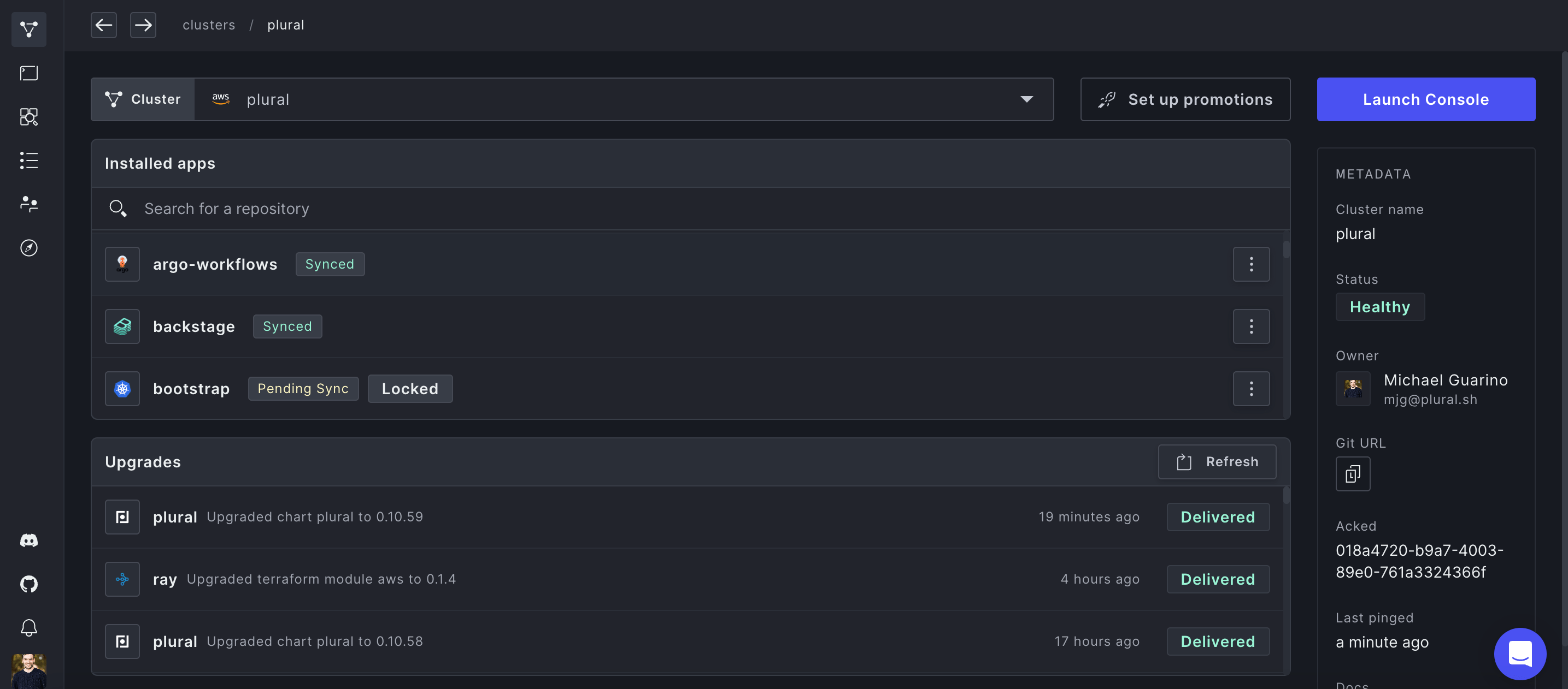 plural deployfor that app will mark it as synced. - Locked/Unlocked - This state is used when a manual change is needed. Some changes – like kubernetes upgrades or heavy app migrations – need to be applied manually and not by our console, and this state is meant to pause upgrades for that app until you explicitly mark it as having been applied with